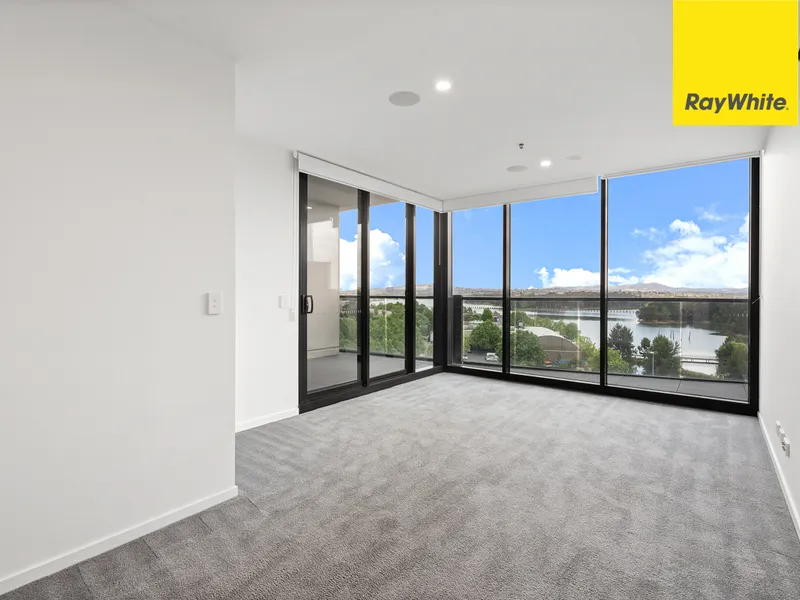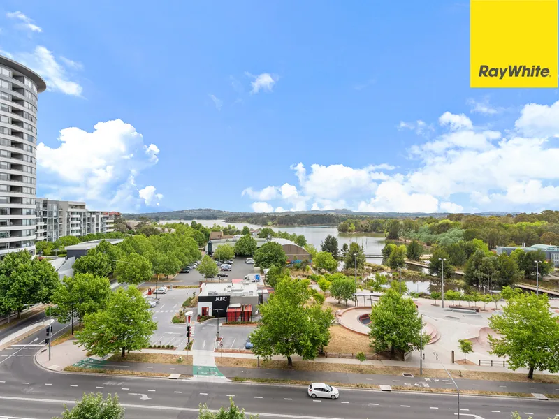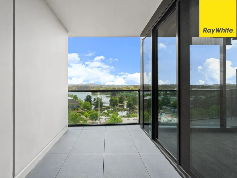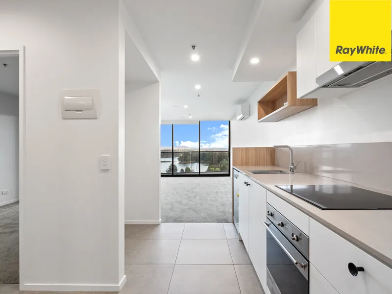 The property showcases a light-filled open concept living and dining space that flows onto a balcony to extend your living space out to the fresh air, perfect for taking in the panoramic views over the Town centre to Lake Ginninderra. The sleek kitchen is neatly configured to allow you to maximise the space and is superbly appointed with stone benchtops, blonde timber cabinetry, open display shelving, a dishwasher, an induction cooktop and plenty of bench and storage space.