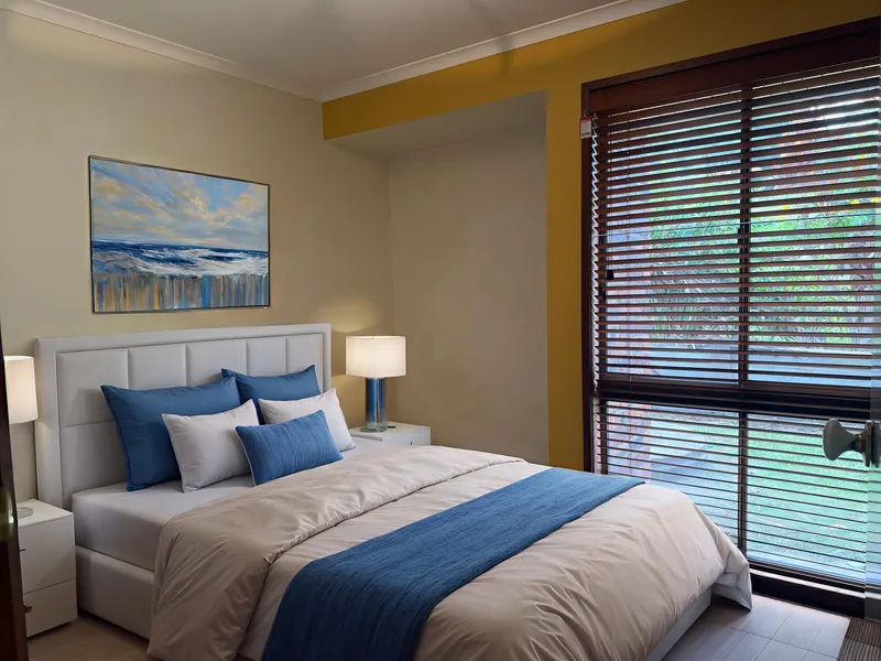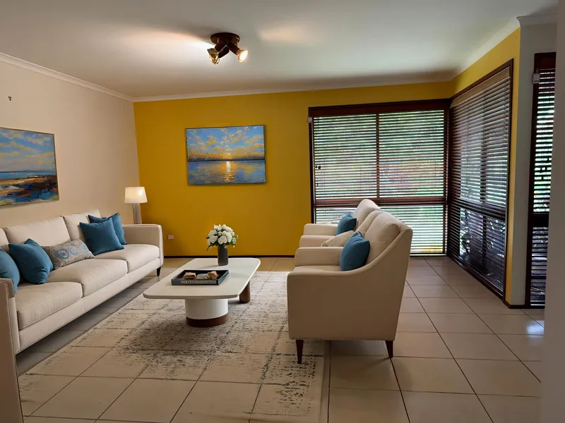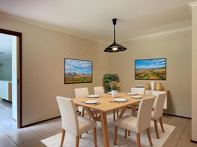The large four-bedroom home is designed for both formal entertaining and relaxed family living. The main bedroom features a private ensuite, while the remaining bedrooms are serviced by a central family bathroom.