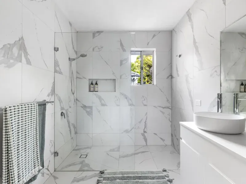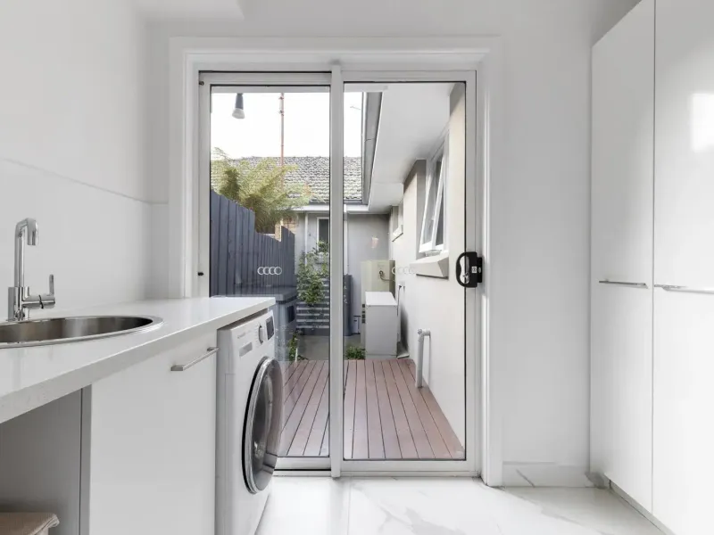 The accommodation includes three well-proportioned bedrooms, with the main bedroom offering a walk-in robe and a sleek ensuite. Two additional north-facing bedrooms with built-in robes are serviced by a striking fully tiled central bathroom. A well-appointed laundry with direct access to a private deck adds further practicality.