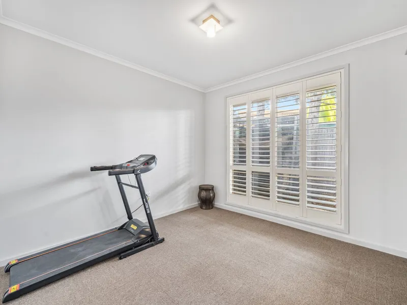 Stylish plantation shutters feature throughout, while ceiling fans, ducted heating and split system cooling ensure year-round comfort. A double garage provides secure parking and practical storage, while a dual access-laundry further adds to the practicality.