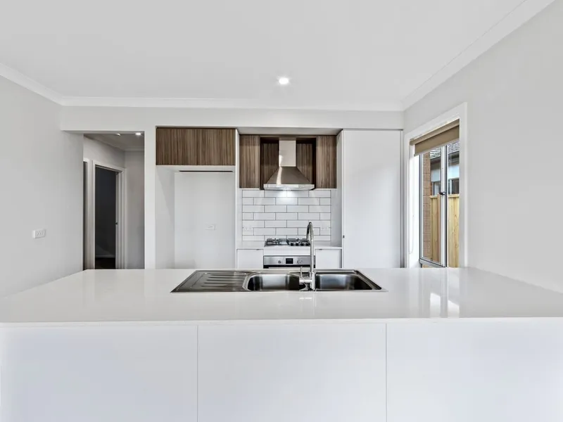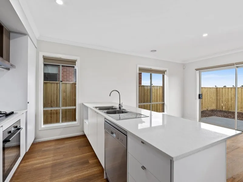 Designed with practicality in mind, this home features a light-filled layout complemented by quality finishes throughout. The modern kitchen is equipped with stainless steel appliances, a sleek white stone benchtop, and ample storage, seamlessly connecting to the open-plan living and dining area – ideal for everyday living.