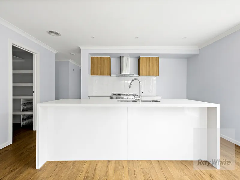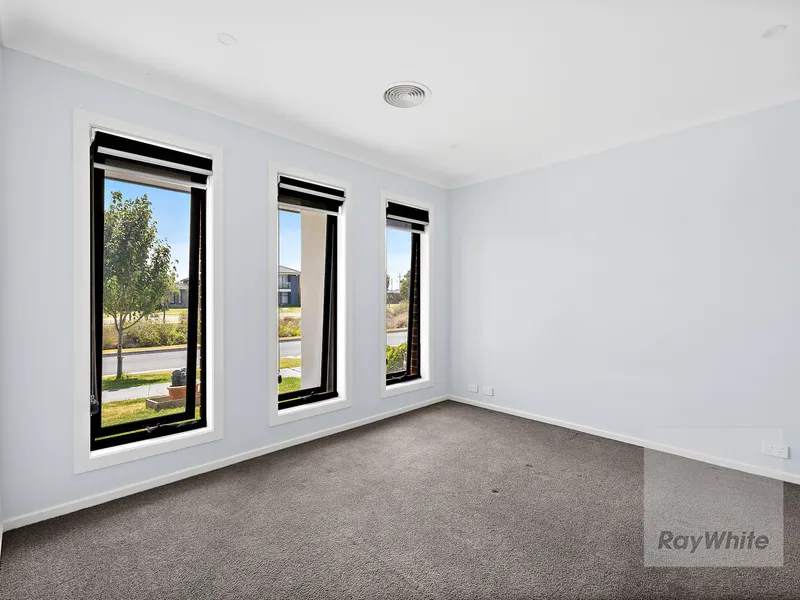 The light-filled interior features a master bedroom with walk-in robe and private ensuite, three additional bedrooms with built-in robes, a central study/retreat, and a stylish family bathroom with freestanding tub. At the heart of the home is an expansive open-plan living and dining area, complemented by a stone-bench kitchen with island breakfast bar, walk-in pantry, 900mm appliances, and dishwasher.