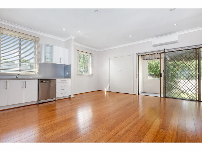 The modern kitchen exudes sophistication, featuring stainless steel gas appliances, a dishwasher, and ample cupboard and bench space. The three generously sized bedrooms are carpeted for comfort and share the convenience of a renovated bathroom with a spacious shower and modern neutral tones.