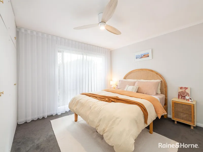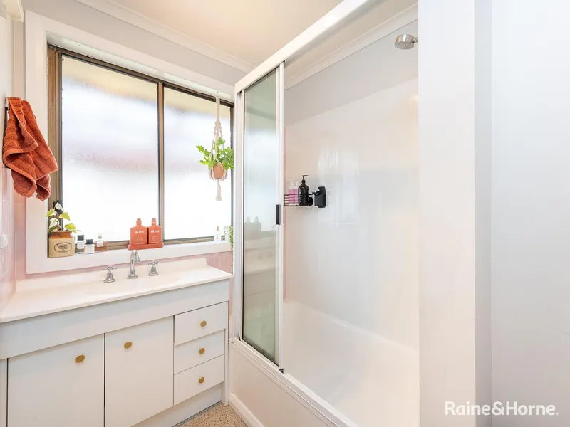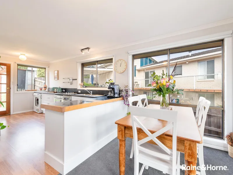 A door from the kitchen leads out onto a delightful semi-enclosed deck positioned in the fully fenced low-maintenance back garden.