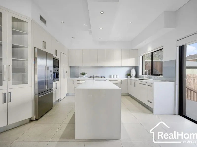 • High-end polyurethane kitchen with stone benchtops, gas cooktop, island bench & integrated appliances
