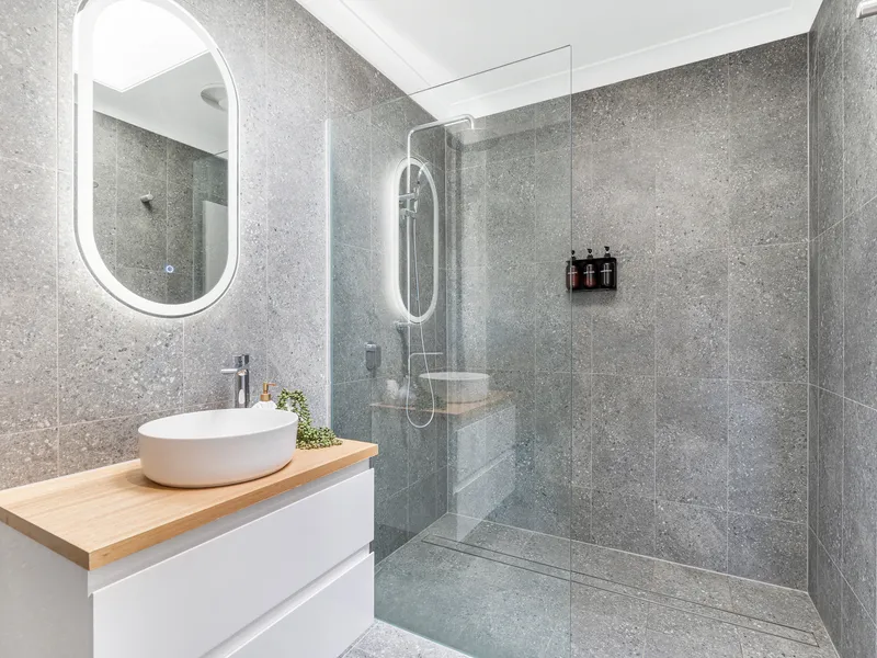 * Modern bathroom with walk?in shower and full?height tiling
