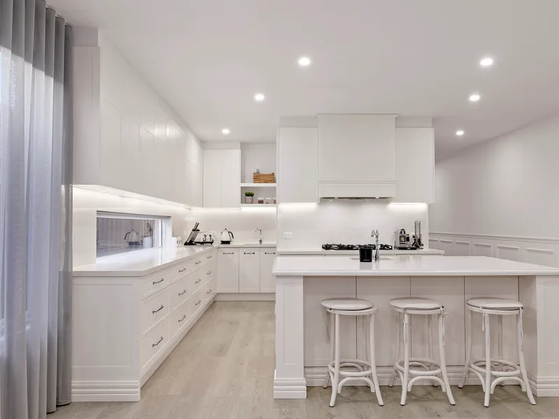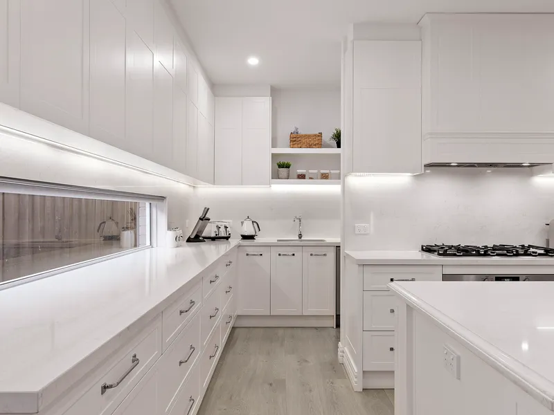 • Designer kitchen showcasing 40mm Caesarstone benchtops, extensive cabinetry, plumbed fridge space, butler's pantry and quality stainless-steel appliances including a 900mm gas cooktop, electric oven, rangehood and dishwasher