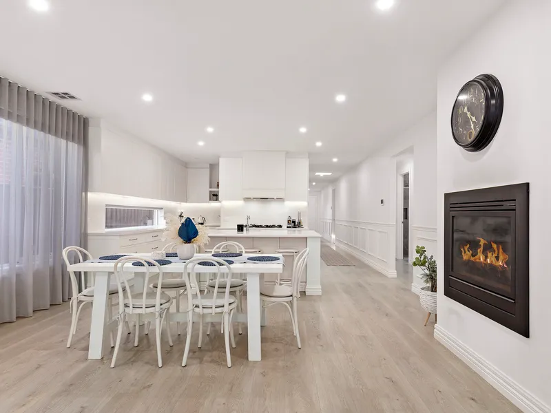 • Sun-drenched open-plan kitchen, dining and living domain anchored by a gas log fireplace, forming the heart of the home
