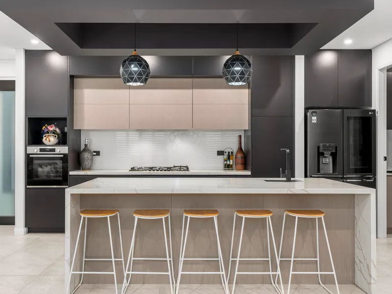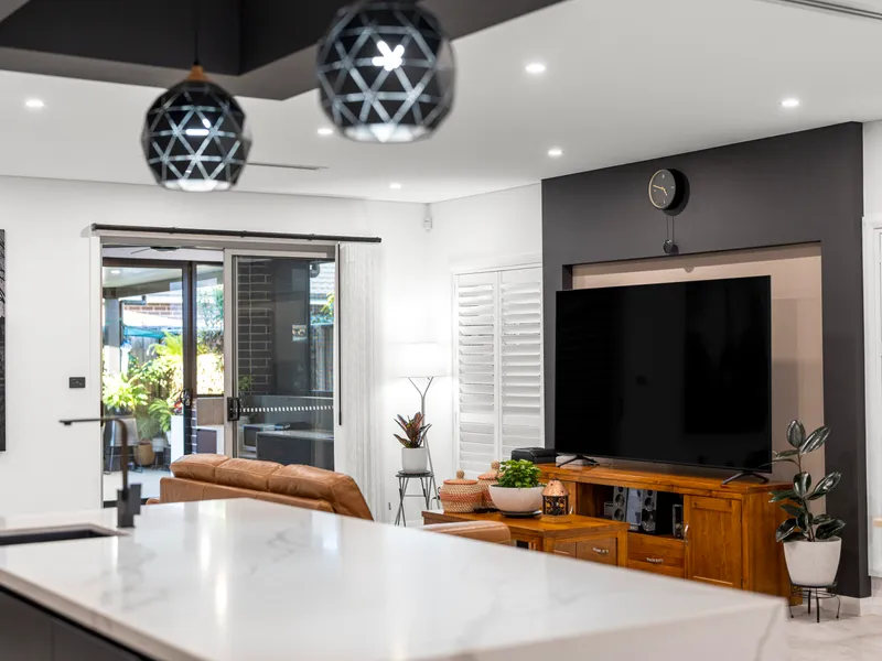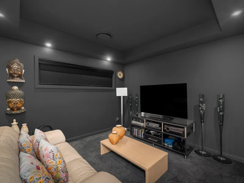 At the heart of the home lies a beautifully appointed kitchen, designed to impress. Featuring a large island bench, Bosch appliances, built-in dishwasher, and an expansive walk-in pantry complete with an additional sink, it's a dream for entertainers and home chefs alike. The main living area is enhanced by a striking feature wall, offering warmth and sophistication, while the dedicated media room provides a sleek retreat for movie nights or quiet relaxation.