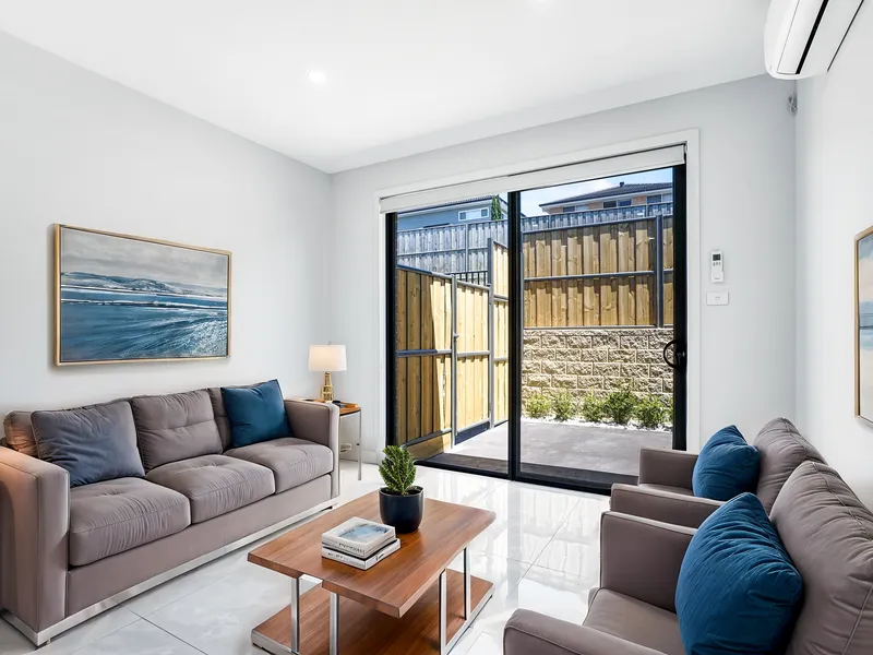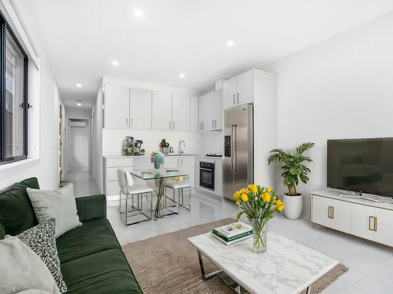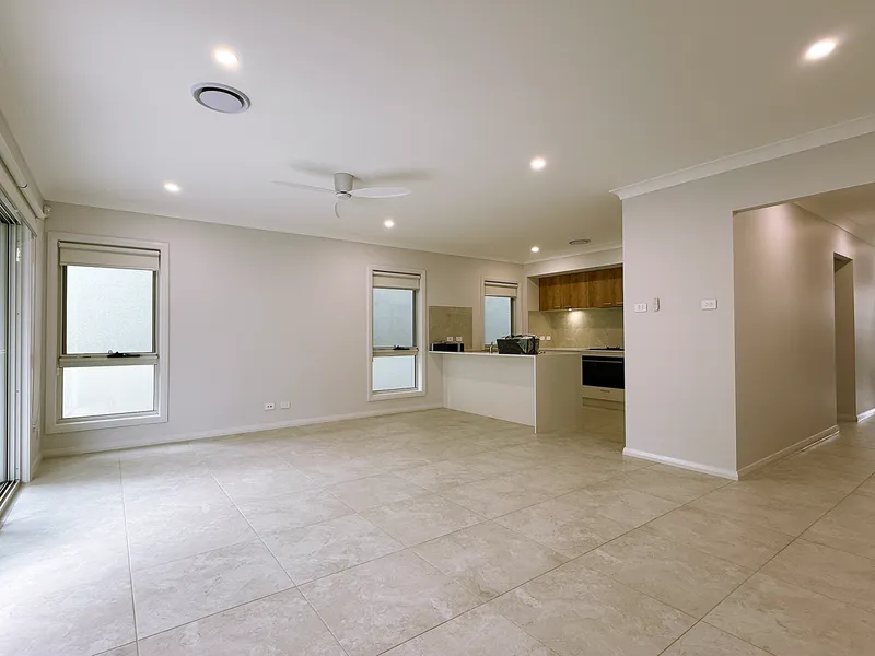 At the heart of the home is a contemporary kitchen equipped with quality appliances, stone bench tops, and ample storage, seamlessly flowing into the open-plan living and dining areas. Large windows allow natural light to fill the home, creating a bright and welcoming atmosphere.