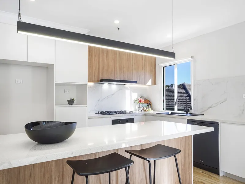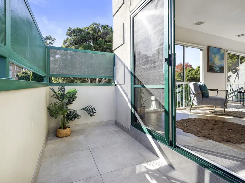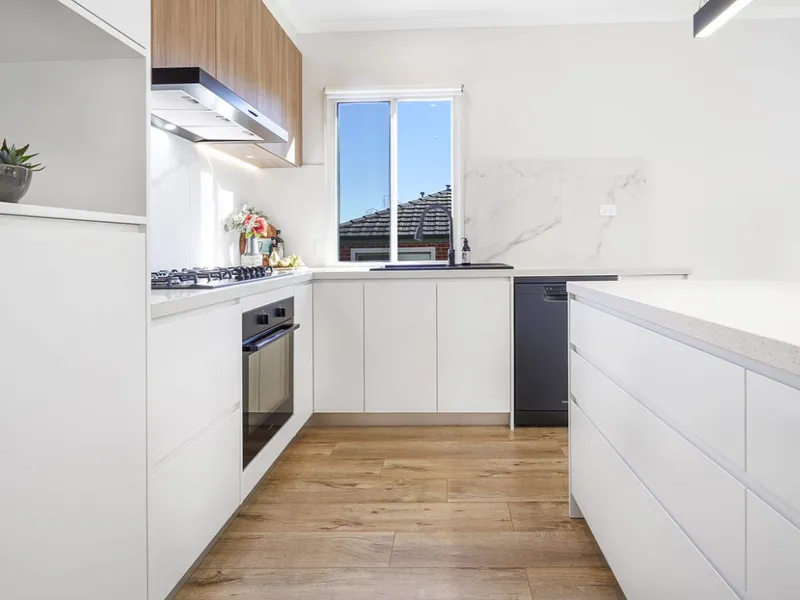 The spacious kitchen boasts ample storage and modern appliances, including gas cooking and a dishwasher. Overlooking the light-filled living area, it seamlessly opens onto a private balcony – perfect for relaxing or entertaining.