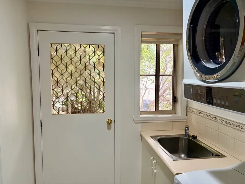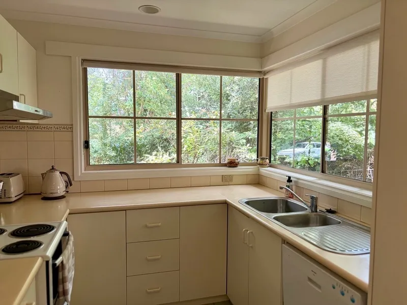 The well-appointed kitchen includes a pantry and dishwasher and enjoys a leafy outlook over surrounding greenery.