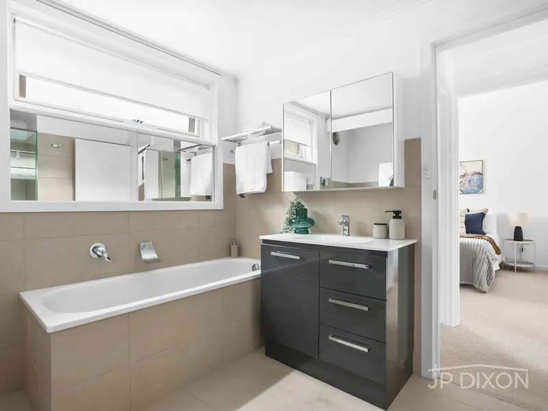 Downstairs are two bedrooms with built-in robes, serviced by a bathroom with integrated laundry and a separate toilet. Additional features include split system heating and cooling, tiled flooring, undercover parking for two cars and secure access via a remote-controlled rear gate off St Ninians Court. A private rear gate provides direct access to the Brighton Bay walking trail, perfect for relaxing walks by the water.