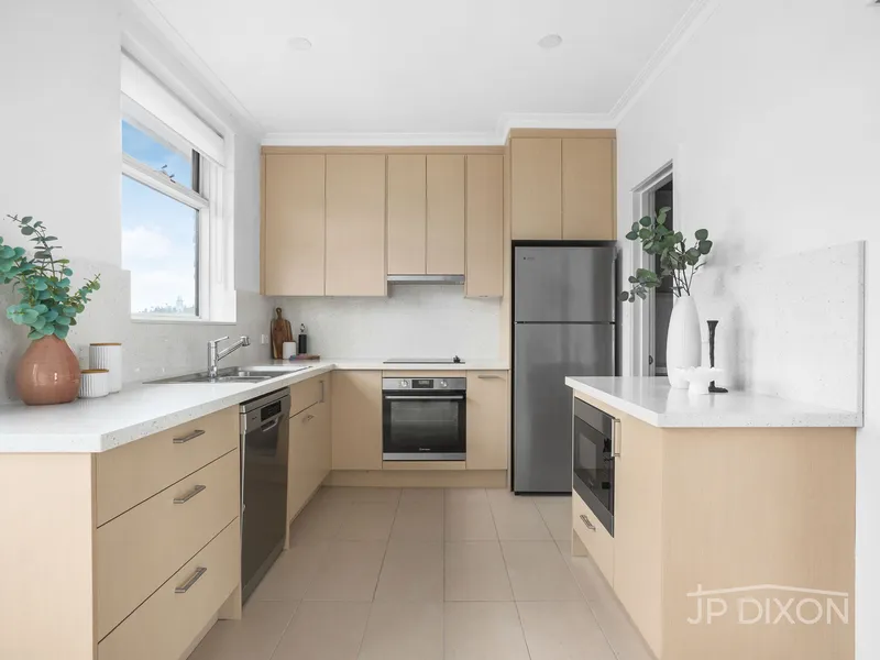 An elevated entry leads to the apartment via a wide tiled staircase framed by neatly maintained gardens. Inside, double-glazed windows fill the spacious living and dining area with natural light while capturing panoramic views across the water to the Brighton Baths. The modern kitchen features a Westinghouse oven, gas cooktop and a generous walk-in pantry with ample storage.