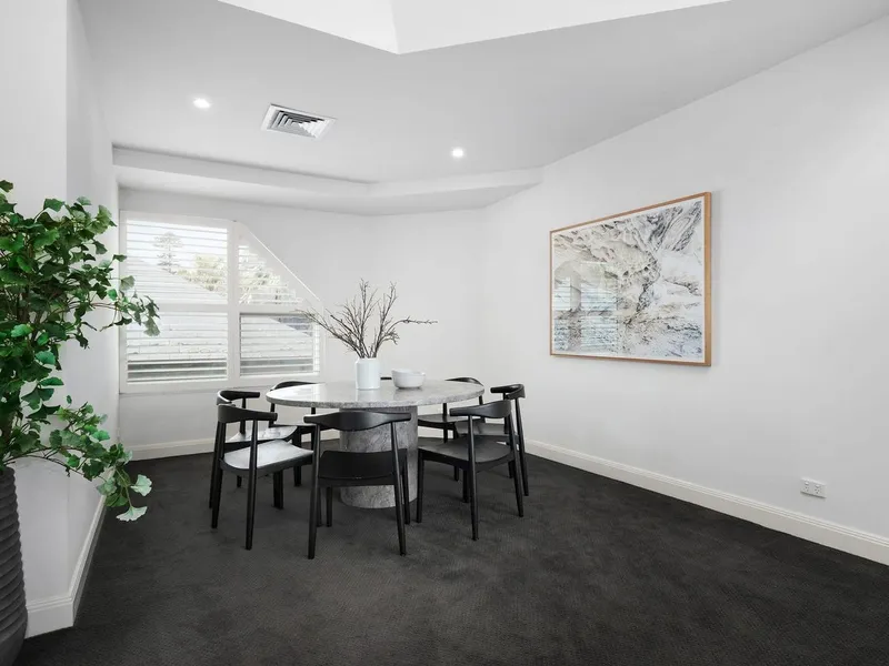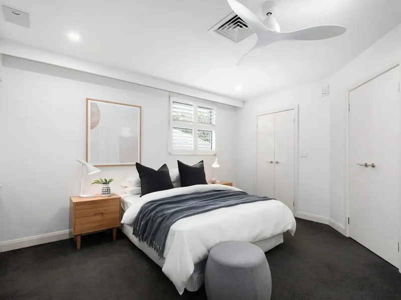 Additional features include a well-proportioned laundry with storage, ducted vacuum system, reverse-cycle heating and cooling, and secure basement parking for two vehicles.