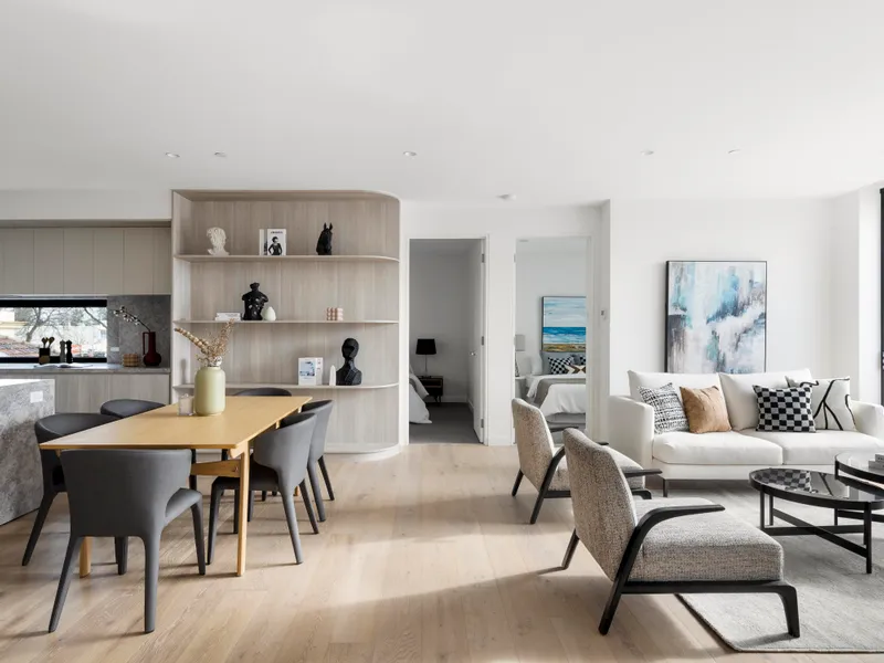 Thoughtfully designed, the apartment reveals a beautiful north-facing open-plan living and dining zone, anchored by a striking limestone kitchen appointed with premium Miele appliances, a Qasair rangehood, and an integrated fridge/freezer.