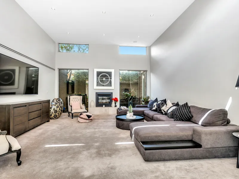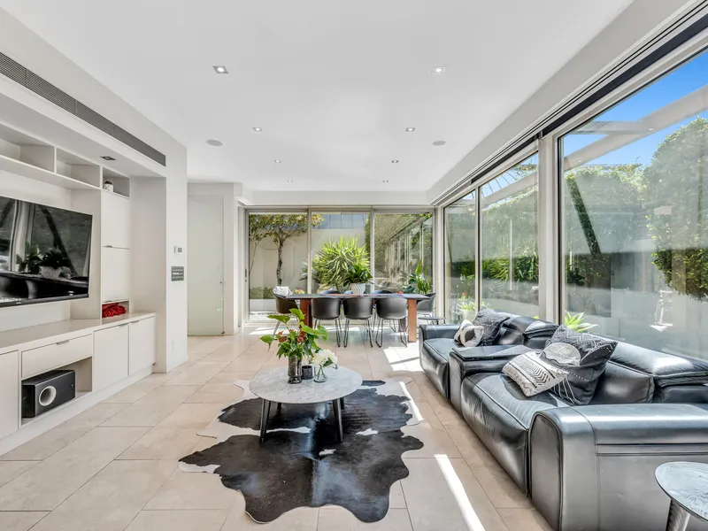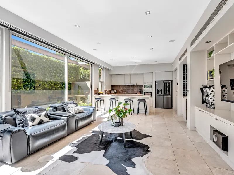 A tall pivot door and double height entrance introduce a free flowing floor plan with an incredible sense of space and light further enhanced by extensive glazing and luxurious Travertine flooring (under-floor heating). A private master retreat featuring an oversized dual vanity en suite and walk in robe, executive study or fourth bedroom (built in robes), and powder room precede breathtaking dual living zones.