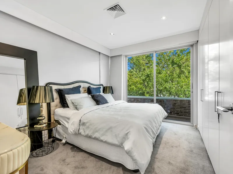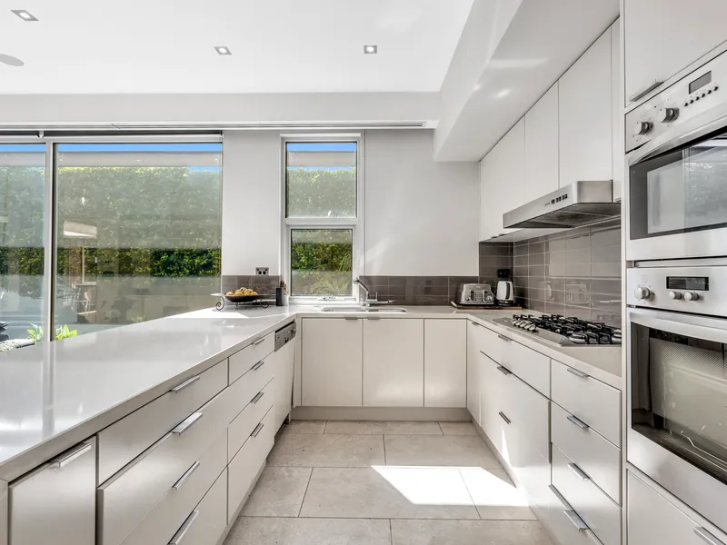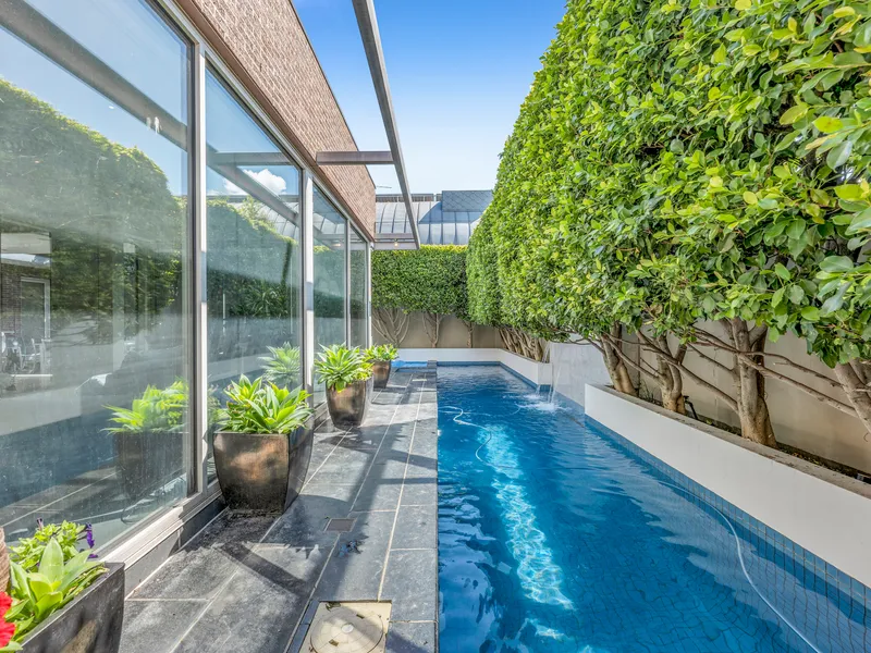 The lofty formal lounge flaunts three meter ceilings and is sure to become your favourite place to relax by the gas log fire or enjoy pre-dinner drinks. An ingenious wall of invisible glass sliders connects this space to tranquil landscaped gardens, al fresco entertaining (BBQ with range hood) and a lap pool & spa.