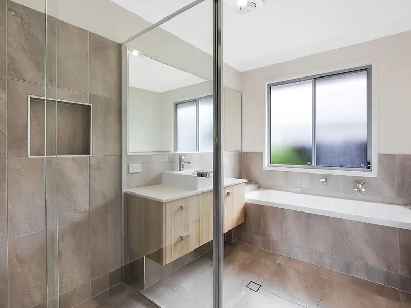 # Main family bathroom with ample storage to vanity and large shower cavity and separate bathtub