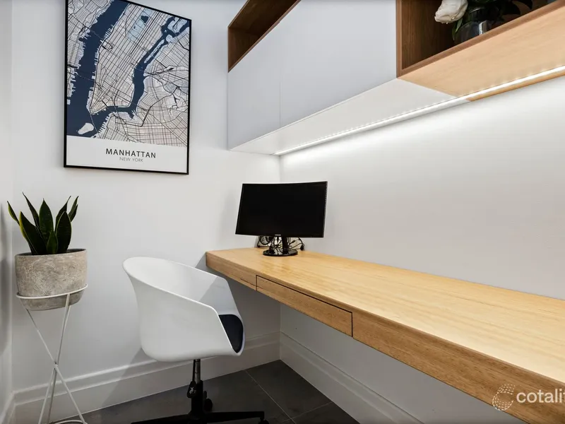 Sliding doors extend the living space to a sheltered alfresco deck with retractable awning and landscaped gardens, perfect for relaxed outdoor enjoyment. A dedicated skylit study with built-in desk and shelving, guest powder room and large laundry further enhance functionality.