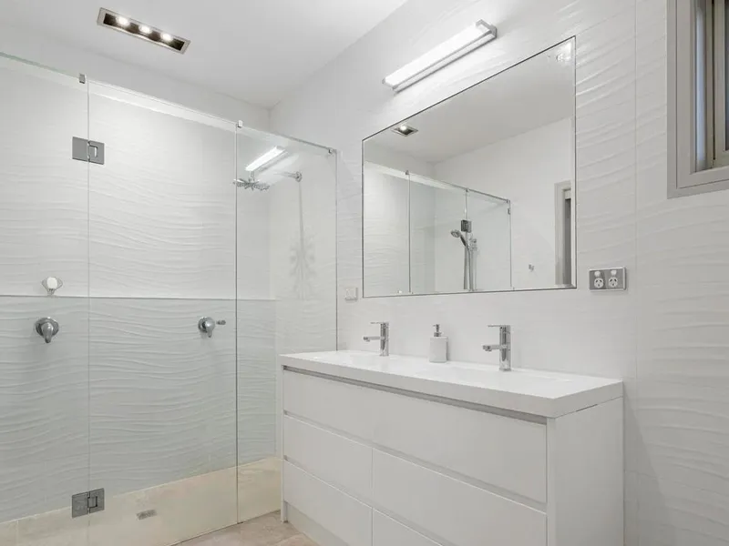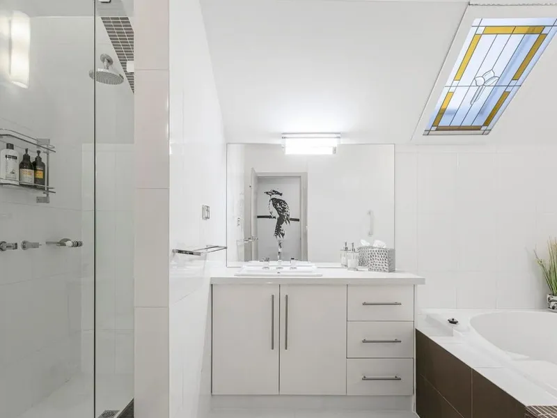 The ground floor also includes a private main bedroom suite with ample wardrobe space and a refined ensuite featuring a double shower and twin vanities. A well-appointed laundry and guest powder room complete the downstairs layout.