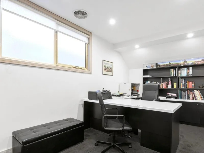 Upstairs, a sunlit retreat creates an additional living area and sits alongside a generous fitted study, ideal for those working from home. Two further bedrooms, both with built in robes, share a stylish fully tiled bathroom complete with a spa bath.