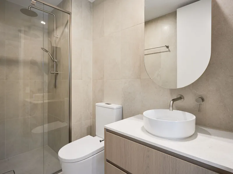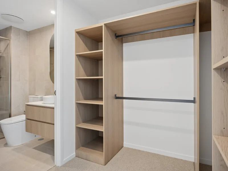/ High-quality joinery includes built-in bedroom robes with open shelves and hanging rails, along with custom bathroom vanities featuring soft-close drawers;