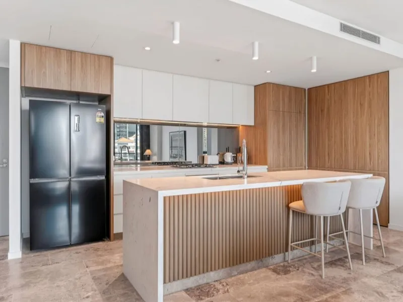 - Designer kitchen with premium appliances, stone benchtops and integrated dishwasher