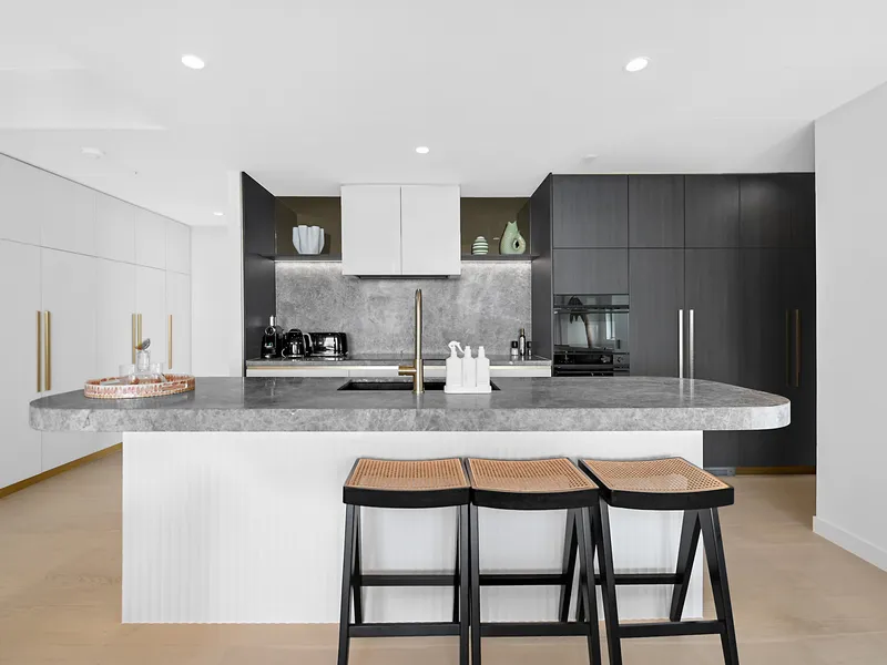Designed to maximise light, space and views, the open-plan living and dining area flows seamlessly to a generous balcony, ideal for entertaining or simply unwinding while taking in the coastal skyline. Floor-to-ceiling glazing captures abundant natural light and enhances the sense of elevation throughout.