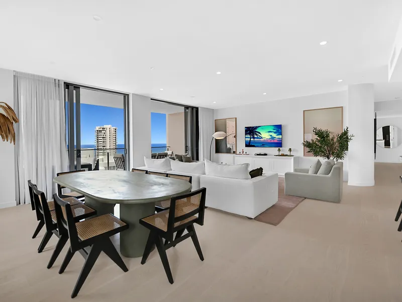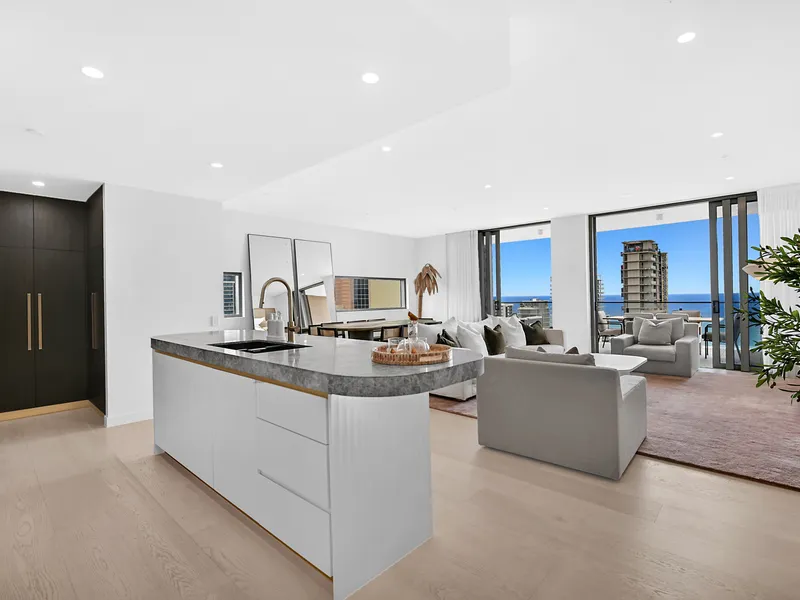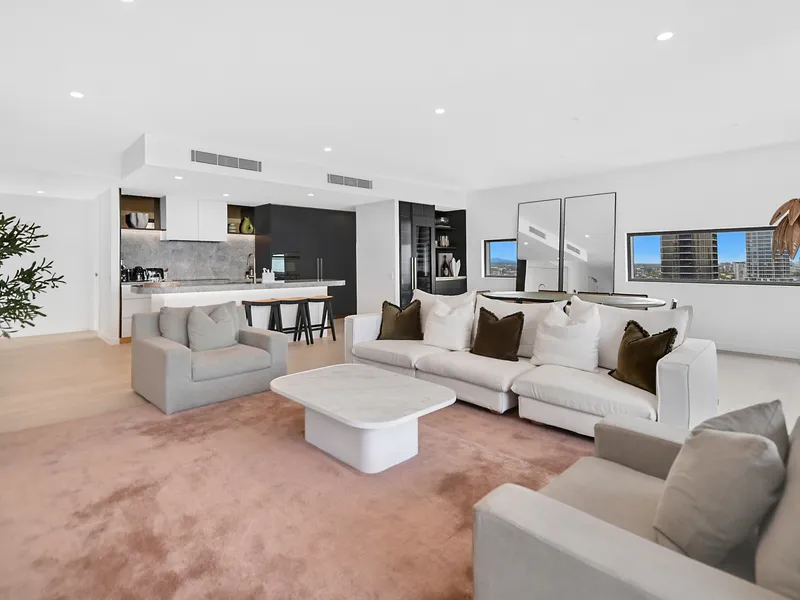 Positioned high on the 14th floor, this sophisticated apartment delivers an exceptional lifestyle defined by panoramic outlooks, refined interiors and a premier Broadbeach address. Set within a sought-after residential building on Surf Parade, the home offers the perfect balance of luxury, comfort and convenience.