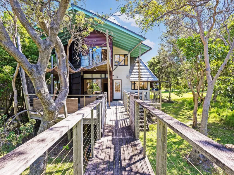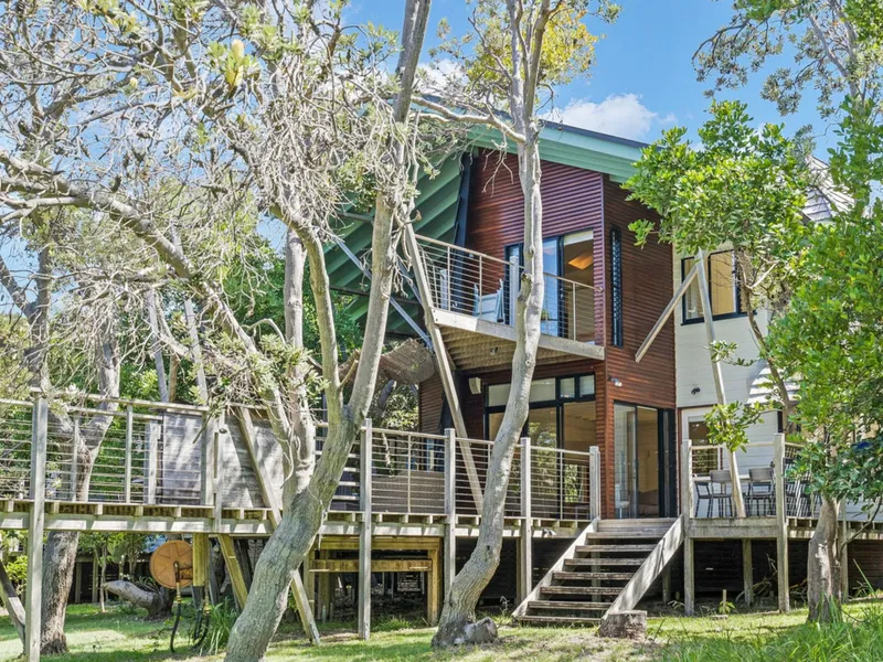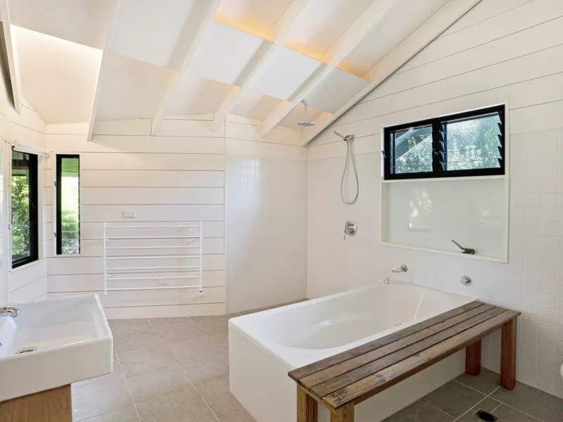Upstairs, the main suite is positioned amongst the treetops with its own private deck and stunning ocean outlook. This peaceful sanctuary includes a walk-through wardrobe, reverse cycle air conditioning and an oversized bathroom with a freestanding bath positioned to take in the surrounding views.