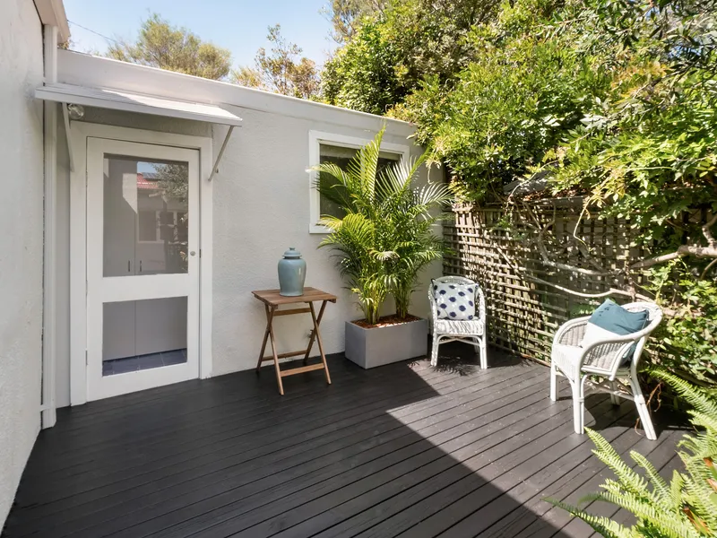 A Charming freestanding cottage with loads of storage and garaging. The property has just been refreshed and provides spacious living and dining options, with 3 bedrooms, high ceilings and timber floors thorughout. A private outdoor deck to the East and a fabulous garden filled with natives and herbs to the North with outdoor shower for when you return from the beach.