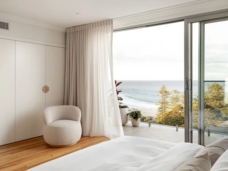 • Master bedroom with ocean views, king bed, built-in robes, designer ensuite, and access to terrace