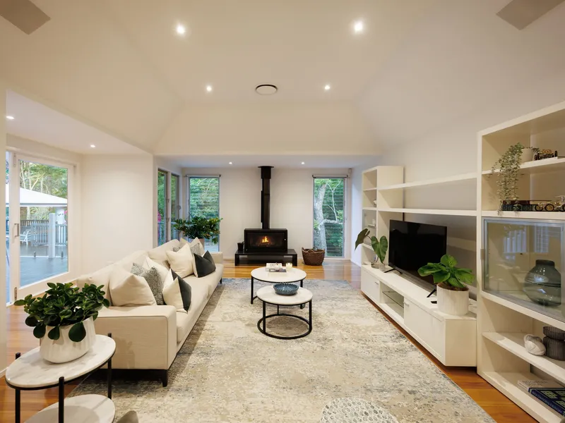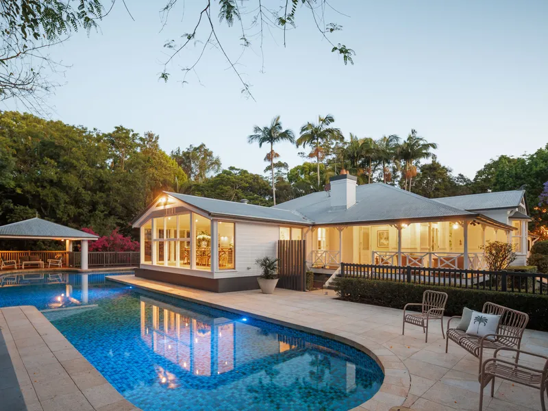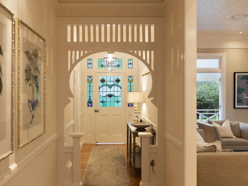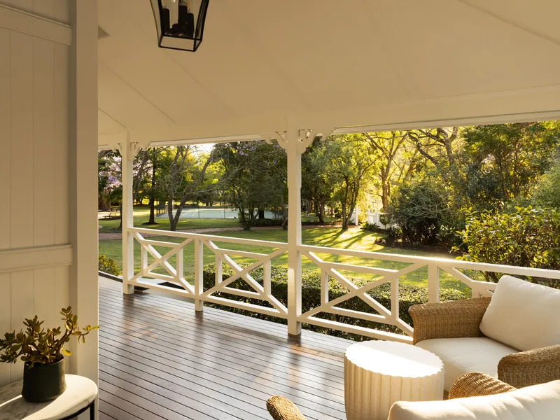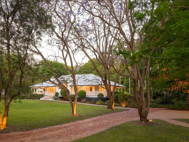 Originally built in 1912 and relocated from Alderley, this beautifully restored residence is a rare offering in prestigious Brookfield. Enveloped by 2.2 acres of manicured grounds with an abundance of fruit trees and mature Jacarandas blooming with colour, this family home captures the spirit of classic Queenslander living - think wide wraparound verandahs, high pressed metal ceilings, VJ walls and intricate fretwork. The front entry, framed by vibrant stained glass and timber detail, opens to elegant interiors where historical charm and modern function are perfectly balanced.