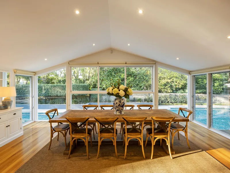 Five bedrooms are complemented by three living zones, including a formal lounge with fireplace and a vaulted-ceiling dining room overlooking the 25-metre saltwater pool. The bespoke Wyre + Craw kitchen is a culinary showpiece with marble island, extensive cabinetry and elite European appliances. Entertain or unwind outdoors on the poolside deck or pavilion and the full size tennis court and bocce pitch allow for more vigorous activities.