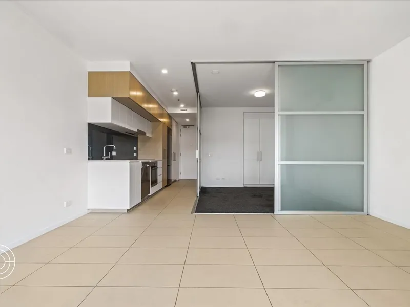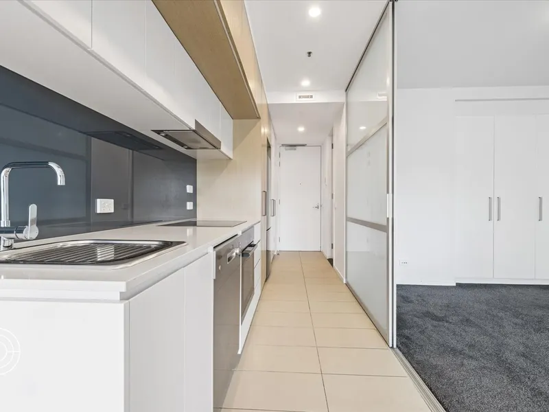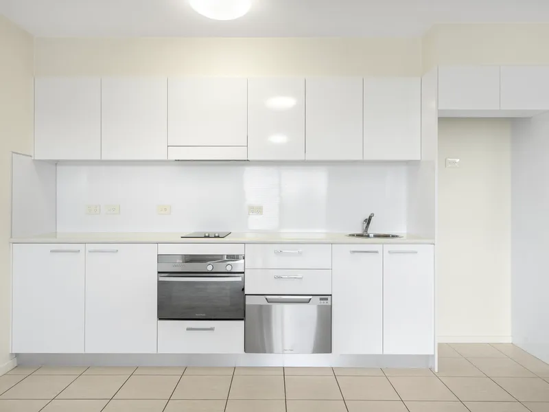 The apartment features an open-plan living area with reverse-cycle air conditioning, flowing seamlessly from the kitchen and opening directly onto a spacious balcony-perfect for relaxing or unwinding after a long day. The kitchen is well equipped with Fisher & Paykel electric cooking appliances, an oven, and a dishwasher, offering both functionality and modern convenience.