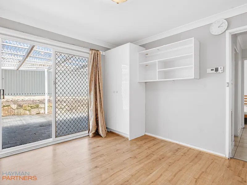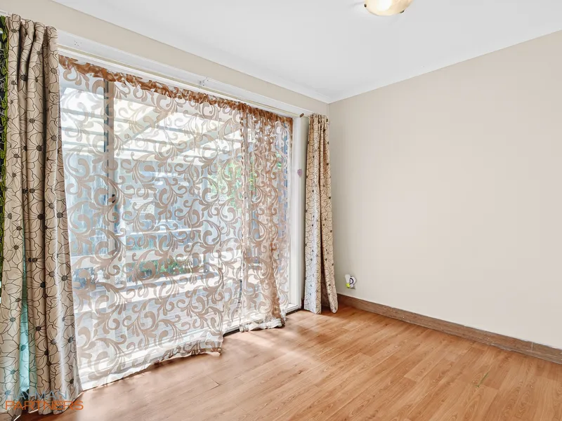 Sliding doors from the living area lead out to a private paved courtyard with a covered pergola, perfect for outdoor dining or relaxing with friends and family. The three well-sized bedrooms provide comfortable accommodation, with built-in storage and easy access to the bathrooms, completing this functional and low-maintenance home.