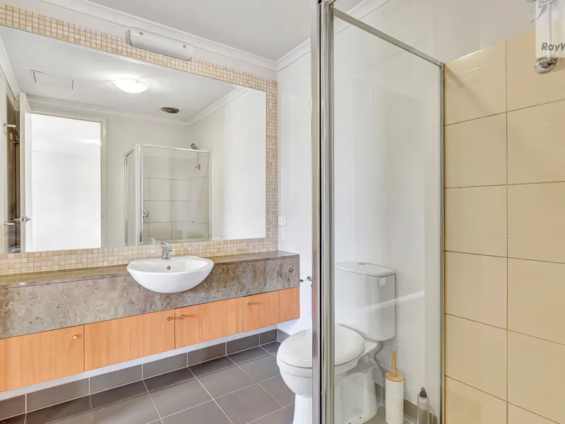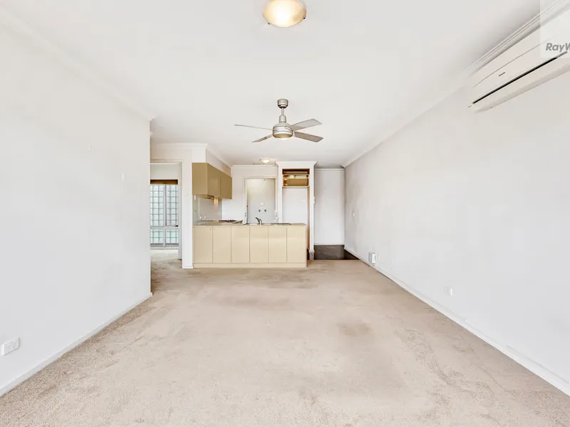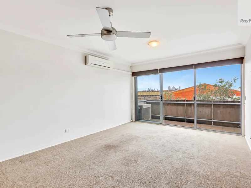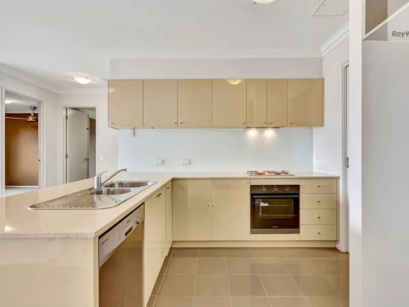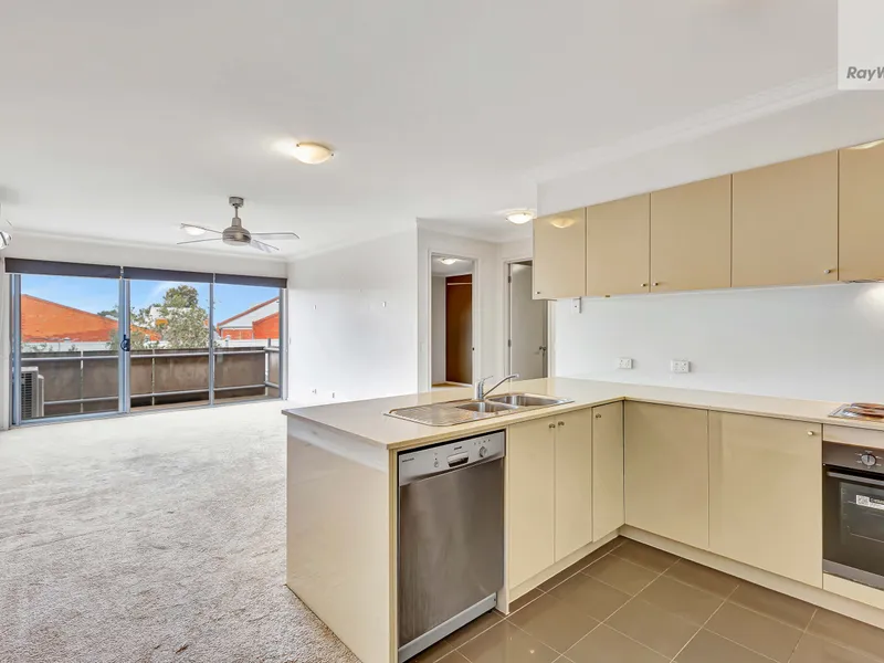 The well appointed kitchen includes ample storage, stainless steel dishwasher, electric cooking and large bench for everyday convenience. Both bedrooms are fitted with built-in robes and ceiling fans, while the central bathroom offers a large vanity, walk-in shower and plenty of space. Additional features include split-system heating/cooling, European laundry, secure intercom entry, car space and storage cage.