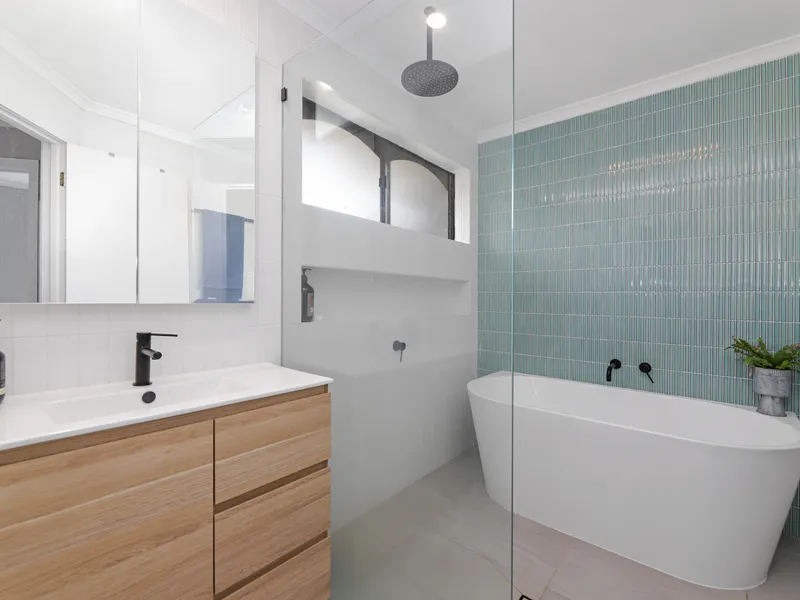 - Renovated sparkling bathroom with large walk-in shower and soaking bathtub