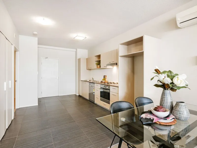 This apartment boasts an open plan kitchen and living that flows through to floor to ceiling glass doors and onto a large, entertainer`s balcony. The kitchen features quality stainless steel appliances makes entertaining a breeze. The master bedroom also opens to the balcony and has a beautifully tiled ensuite, while both bedrooms have floor-to-ceiling mirrored robes and ceiling fans.