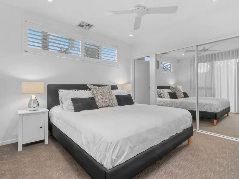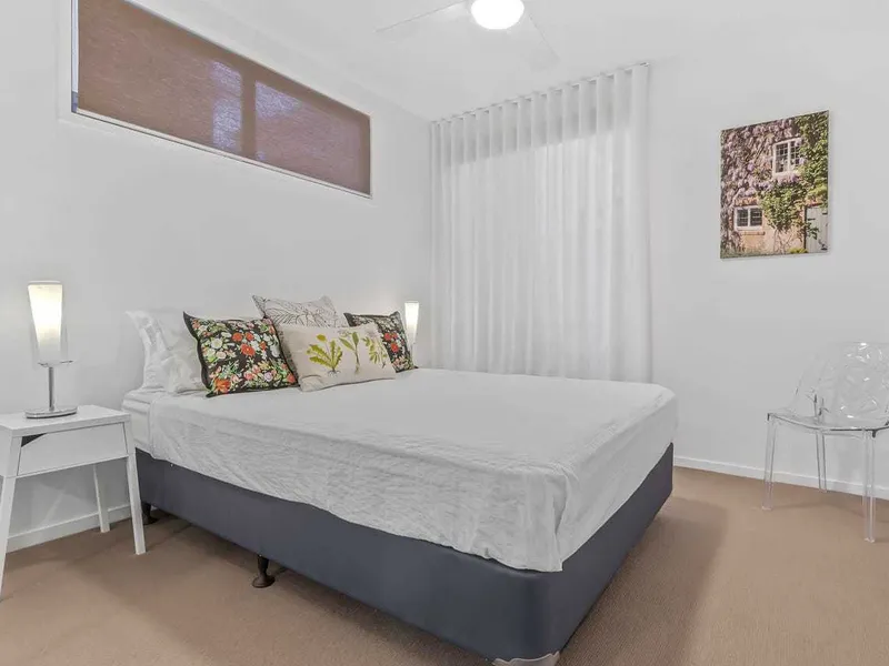 This stunning freehold home combines contemporary design, functionality, and an ideal Bulimba location, offering the perfect low-maintenance lifestyle. All three bedrooms are located on the ground floor, two of which open directly onto a private landscaped garden, ideal for relaxing or entertaining. The ground floor also includes a double garage with storage, laundry room, study nook, and the main bathroom.