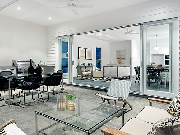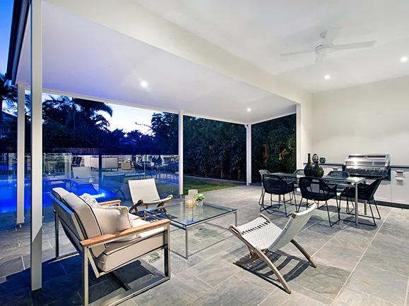 Huge undercover entertaining patio - limestone paving throughout, with built in gas BBQ