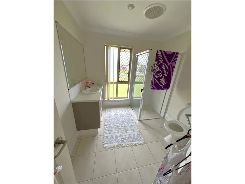 The main bathroom offers includes large shower, bath and vanity, accompanied by a separate toilet.