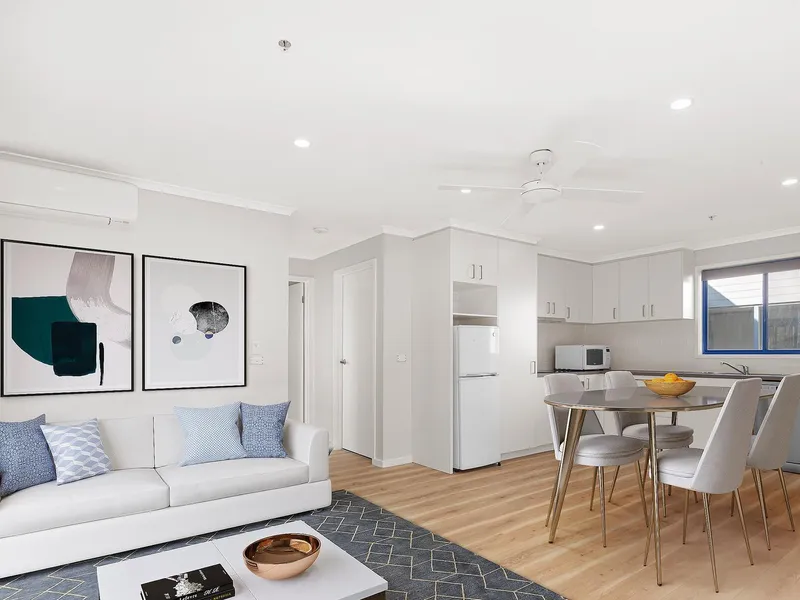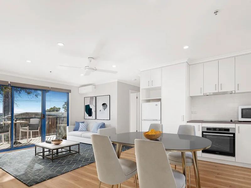The thoughtful layout spans two levels, with the ground floor comprising a bedroom, a sleek bathroom, storage and secure internal access from the single lock-up garage which also includes a European laundry and washing line. Upstairs, the open-plan kitchen and living area is bathed in natural light, seamlessly extending onto a private balcony—an ideal space for relaxation. The main bedroom is large and features his and hers robes and ensuite. Features include split-system heating and cooling to ensure year-round comfort, carpet to bedrooms and timber floors to living area.