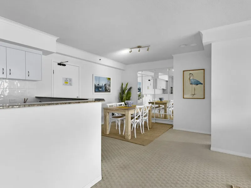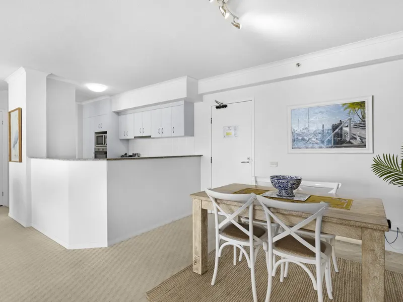 Both bedrooms capture sweeping ocean views, enjoy direct balcony access and feature a private walk-through robes and ensuites. Quality finishes run throughout, with stone benchtops, modern fixtures, and air-conditioning for year-round comfort. With extensive amenities including a heated pool, spa, tennis court, sauna, and BBQ facilities set within lush tropical gardens, this residence offers resort-style living in one of the Gold Coast's most prestigious addresses.