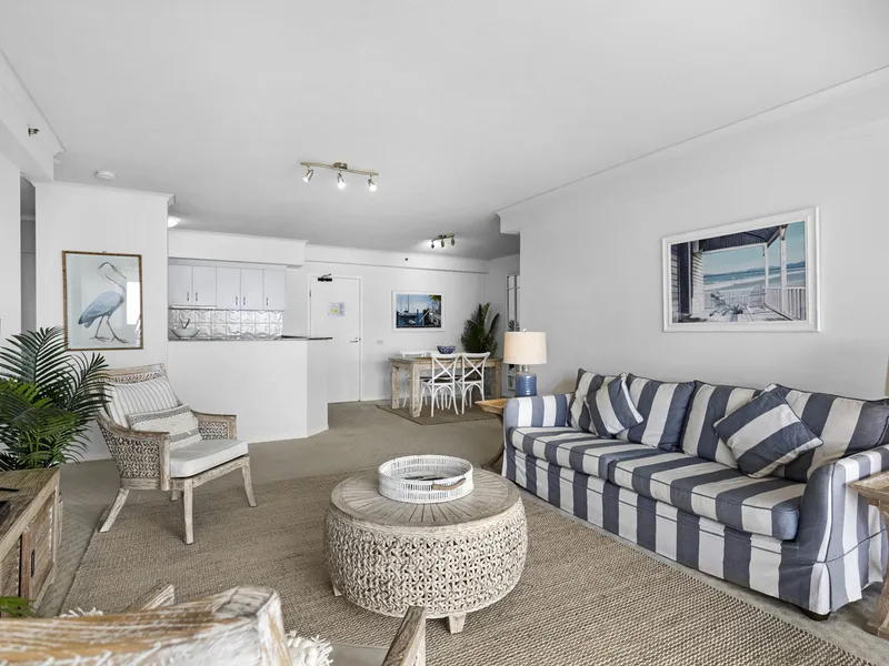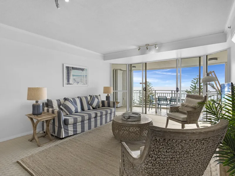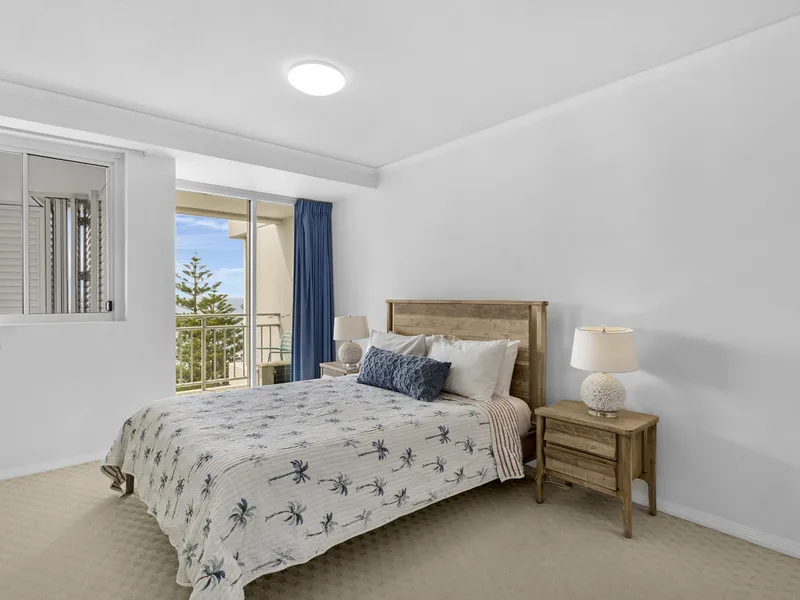 Perched high on the ninth floor of a sought-after beachfront building, this beautifully furnished two-bedroom apartment at 24/186 The Esplanade, Burleigh Heads offers a lifestyle of luxury and convenience. Wake each morning to the soothing sound of the surf and sunrises over the Pacific Ocean, with uninterrupted views that stretch across the iconic Burleigh Headland and sparkling coastline. The spacious, light-filled interiors feature an open-plan kitchen, living, and dining area that flows seamlessly onto a large entertainer's balcony—perfect for soaking in the fresh sea breezes and breathtaking vistas.