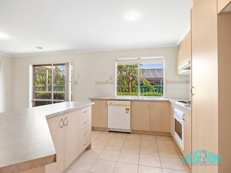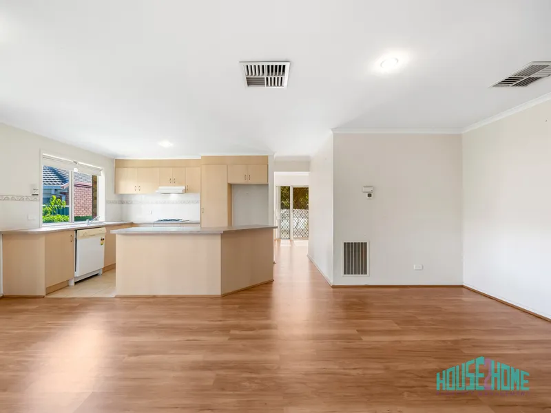 The layout is ideal for families or those who value space, offering two genuinely separate living zones. A large formal lounge provides a quiet retreat at the front of the home, while the open-plan kitchen, meals, and living area forms the heart of the home, perfect for day-to-day living and entertaining. The kitchen is well appointed with a gas cooktop, electric oven, dishwasher, and ample cupboard space.