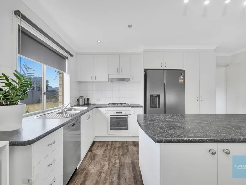 The stylish kitchen boasts modern décor, 900mm stainless steel appliances, a new dishwasher, and stone benchtops, seamlessly connecting to the meals and family area. This space effortlessly extends to the paved entertainment area and backyard.