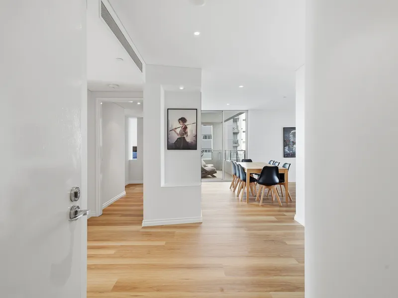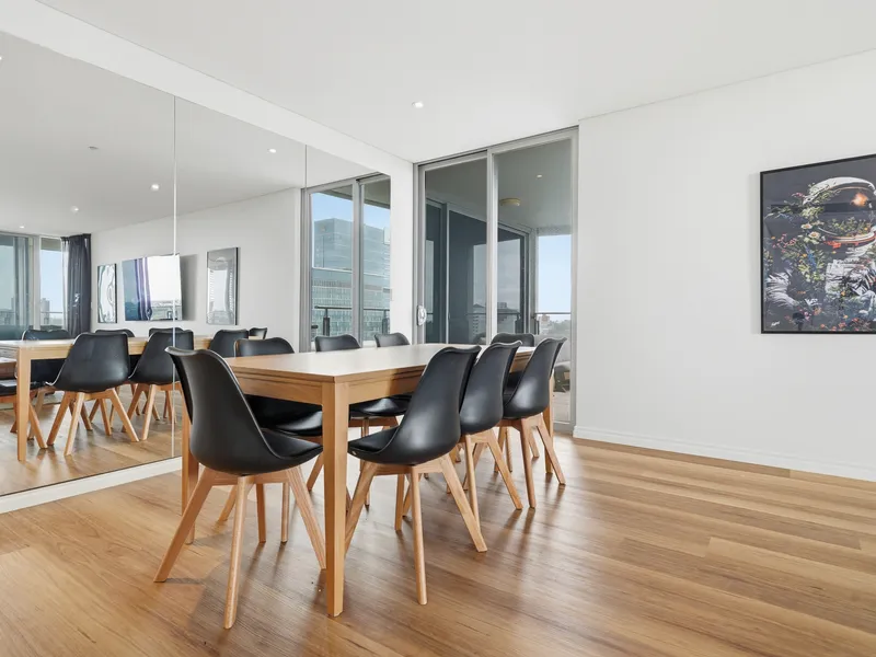 Featuring three bedrooms and two bathrooms, the apartment is ideal for professionals, couples, or small families seeking convenience and lifestyle. The open-plan living and dining area flows seamlessly to take advantage of the elevated outlook, while large windows bring in plenty of natural light.