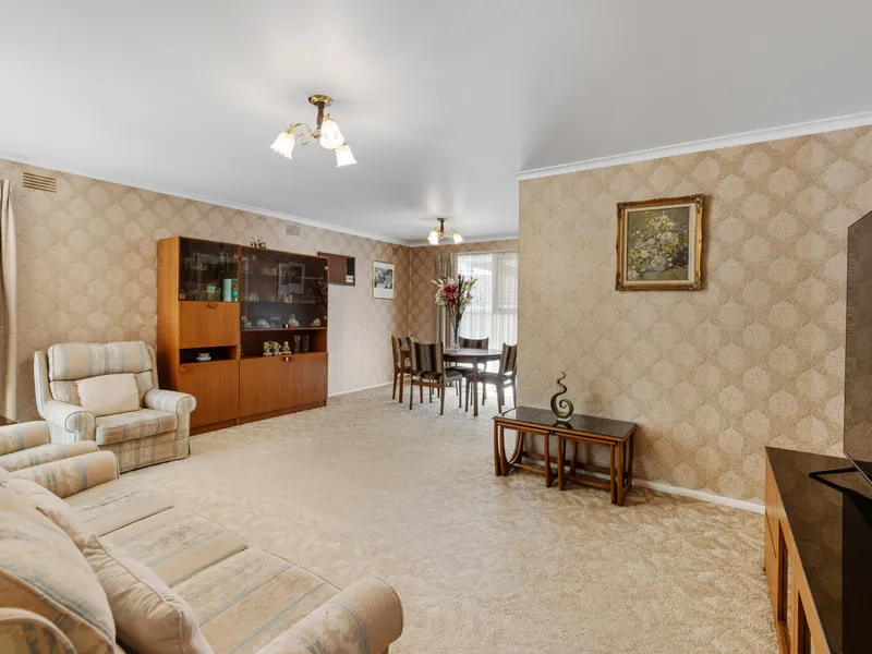 Inside, a spacious lounge and adjoining dining area provide an inviting setting for everyday living and entertaining, while the well-kept kitchen features a breakfast bar and pleasant garden outlook.